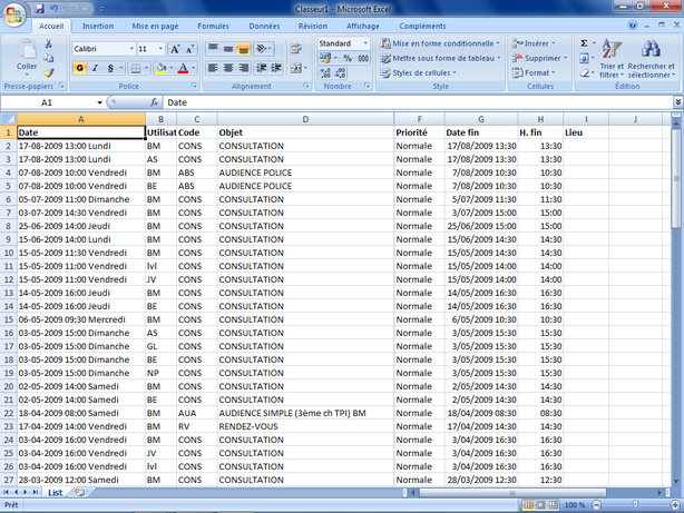 L'exportation vers Excel permet de transférer les données de l'affichage courant dans une feuille du tableur Excel comme illustré. Une fois les données transférées, vous pouvez les manipuler comme vous le désirez à partir de Microsoft Excel et profiter par exemple des possibilités de calcul, de génération de rapport et de graphiques, de sauvegarde ou d'exportation de ce programme.