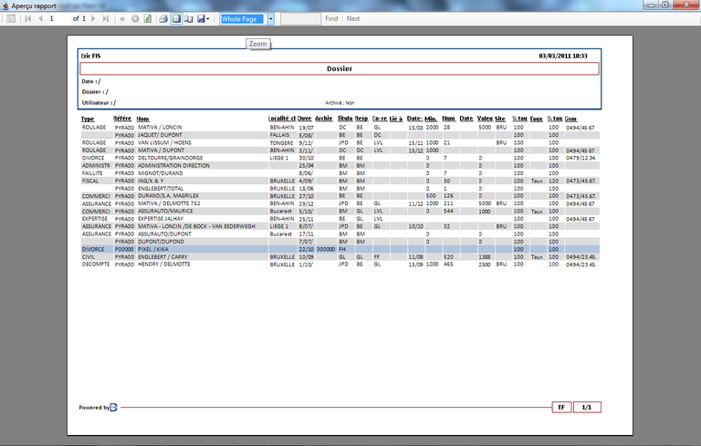 Aperçu avant impression d'un rapport tiré de l'interface d'un dossier