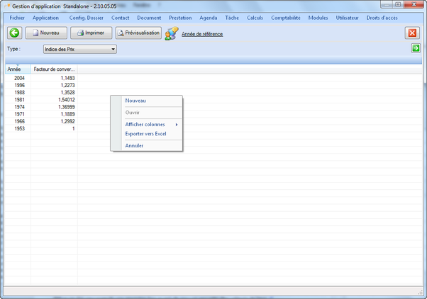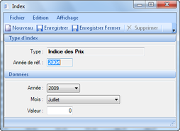 Ce tableau affiche par année de référence la valeur des index de chaque mois. Les index peuvent être actualisés à partir de cet écran, mais il sera plus simple d’importer la mise à jour des index à partir du site, voir ci-après.