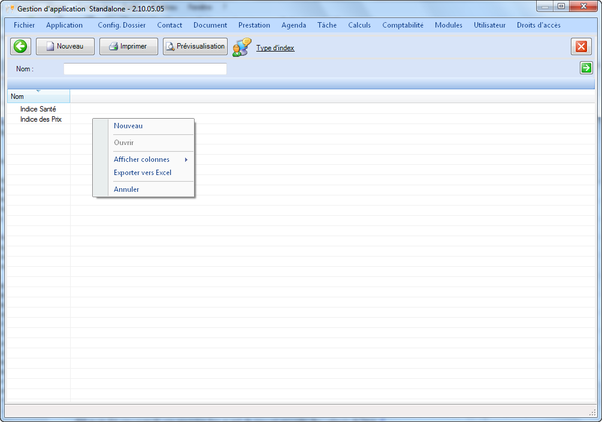 Il est possible de visualiser un aperçu avant impression et d'imprimer la liste des types d'index ainsi que d'en créer un nouveau. Lors de la création d'un nouveau type d'index la fenêtre illustrée ci-après apparaît.
