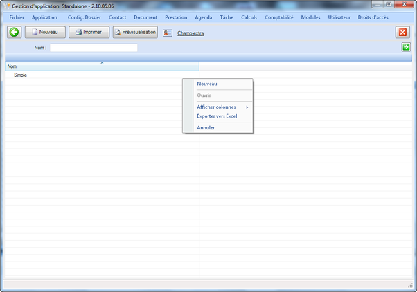 Il est possible de visualiser un aperçu avant impression et d'imprimer la liste des champs extra ainsi que d'en créer un nouveau. Lors de la création d'un nouveau champ extra, la fenêtre illustrée ci-après apparaît.