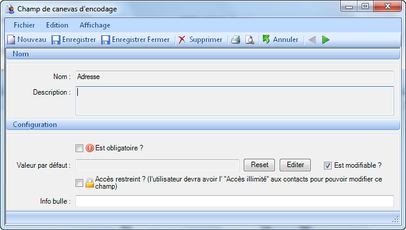 Pour supprimer ou modifier un canevas, ouvrez-le, effectuez vos modifications et sauvegardez. Chaque champ du canevas est modifiable en double cliquant sur son nom et une fenêtre de modification apparaît comme illustré ci-après. Il est également possible de marquer les champs comme obligatoires ou d'en restreindre l'accès à l'aide du menu contextuel de la partie de la fenêtre listant les différents champs.