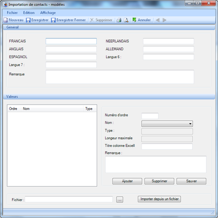 Il est possible de visualiser un aperçu avant impression et d'imprimer la liste des modèles d'importation de contacts ainsi que d'en créer un nouveau. Lors de la création d'un nouveau modèle d'importation de contacts, la fenêtre illustrée ci-après apparaît.