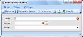Il est possible de visualiser un aperçu avant impression et d'imprimer la liste des formules d'introduction ainsi que d'en créer une nouvelle. Lors de la création d'une nouvelle formule d'introduction, la fenêtre illustrée ci-après apparaît.