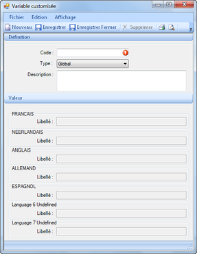 Il est possible de visualiser un aperçu avant impression et d'imprimer la liste des variables customisables ainsi que d'en créer une nouvelle. Lors de la création d'une nouvelle variable, la fenêtre illustrée ci-après apparaît.