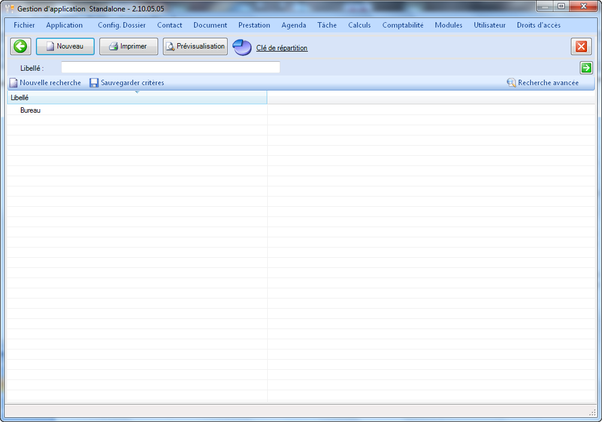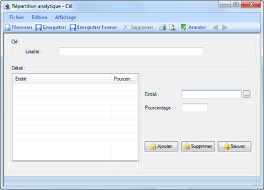 Encodez le libellé de la nouvelle clé et enregistrez cette dernière. Vous pouvez ensuite ajouter des entités parmi celles définies ainsi que leur pourcentage. Le total de pourcentages des entités d'une clé doit être de 100.