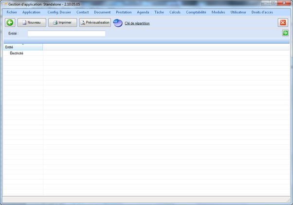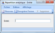 Il est possible de visualiser un aperçu avant impression et d'imprimer la liste des entités ainsi que d'en créer une nouvelle. Lors de la création d'une nouvelle entité, la fenêtre illustrée ci-après apparaît.