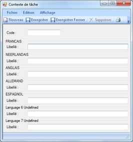Il est possible de visualiser un aperçu avant impression et d'imprimer la liste des contextes de tâche ainsi que d'en créer un nouveau. Lors de la création d'un nouveau contexte de tâche, la fenêtre illustrée ci-après apparaît.