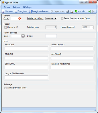 Cochez la case Archiver code tâche pour activer ou non l'archivage de ce type d'entrée tâche.