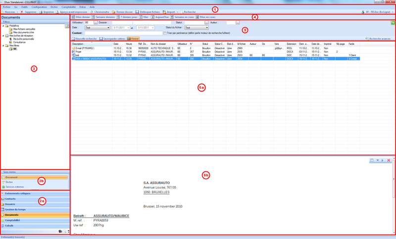 L'interface du cabinet standard telle qu'illustrée ci-dessus, se compose de 6 parties distinctes :