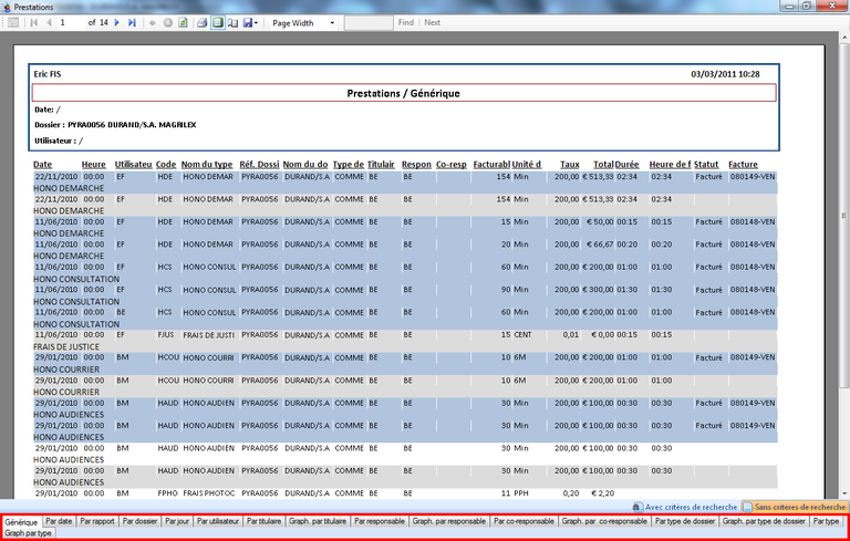 Aperçu avant impression d'un rapport tiré de l'interface du cabinet
