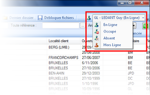 L'illustration suivante montre votre état dans le coin supérieur droit de la fenêtre DLex de l'interface du cabinet. En cliquant sur votre nom, le menu déroulant vous permet de le modifier. Ce nouvel état sera directement visible par les autres utilisateurs.