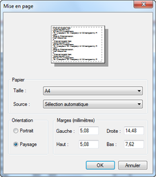 Cette fenêtre permet de définir la taille du papier (A4 par exemple), la source du papier (le bac de l'imprimante), l'orientation du document (portrait ou paysage) et les dimensions des marges.