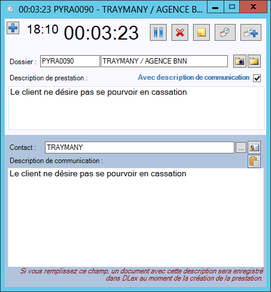 | ◦ | La référence et du nom du dossier si le chronomètre a été lancé depuis un dossier |