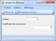 Il est possible de visualiser un aperçu avant impression et d'imprimer la liste des années de référence et de leur taux de conversion ainsi que de créer une nouvelle année de référence. Lors de la création d'une nouvelle année de référence la fenêtre illustrée ci-après apparaît.