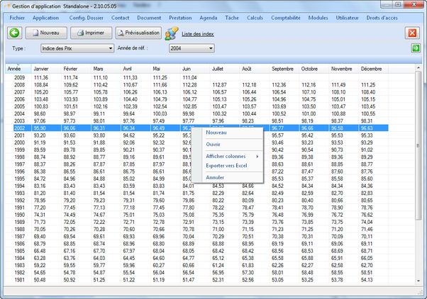 Ce tableau affiche par année de référence la valeur des index de chaque mois. Les index peuvent être actualisés à partir de cet écran, mais il sera plus simple d’importer la mise à jour des index à partir du site, voir ci-après.