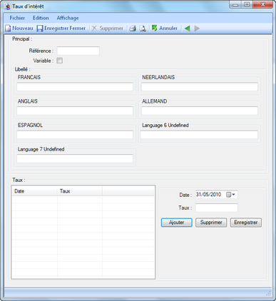Il est possible de visualiser un aperçu avant impression et d'imprimer la liste des taux d'intérêts ainsi que d'en créer un nouveau. Lors de la création d'un nouveau taux d'intérêts, la fenêtre illustrée ci-après apparaît.