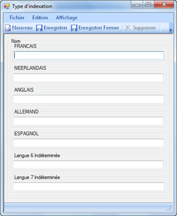 La création d'un type d'index consiste en l'encodage de son nom dans les 7 langues.