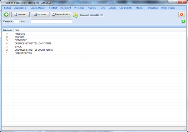 Il est possible de visualiser un aperçu avant impression et d'imprimer la liste des catégories comptables ainsi que d'en créer une nouvelle. Lors de la création d'une nouvelle catégorie, la fenêtre illustrée ci-après apparaît.