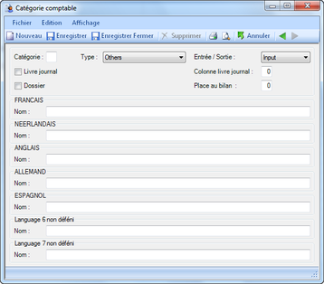 Nom : le nom de la nouvelle catégorie comptable dans les 7 langues de DLex.