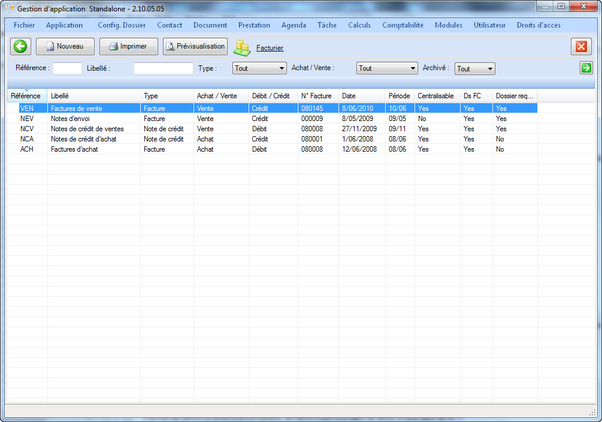 Type et Achat/Vente permettent de sélectionner le type de facturier.