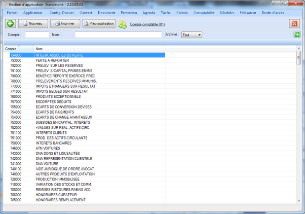 Il est possible de visualiser un aperçu avant impression et d'imprimer la liste des comptes comptables ainsi que d'en créer un nouveau.