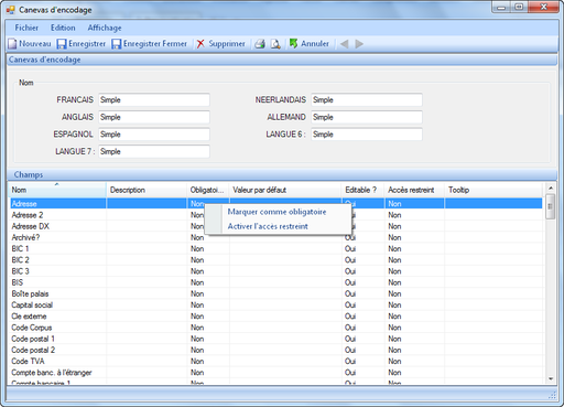 Pour supprimer ou modifier un canevas, ouvrez-le, effectuez vos modifications et sauvegardez. Chaque champ du canevas est modifiable en double cliquant sur son nom et une fenêtre de modification apparaît comme illustré ci-après. Il est également possible de marquer les champs comme obligatoires ou d'en restreindre l'accès à l'aide du menu contextuel de la partie de la fenêtre listant les différents champs.