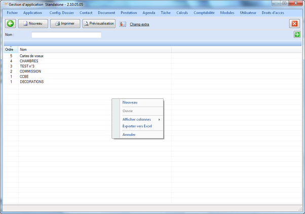 Il est possible de visualiser un aperçu avant impression et d'imprimer la liste des champs extra ainsi que d'en créer un nouveau. Lors de la création d'un nouveau champ extra, la fenêtre illustrée ci-après apparaît.