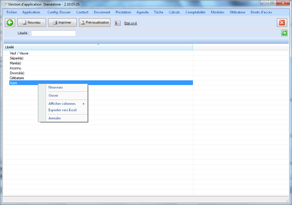 Cliquez sur le bouton État civil : vous obtenez la liste des états civils comme illustré ci-dessous.