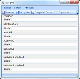 La création d'un état civil consiste en l'encodage de son libellé dans les 7 langues.