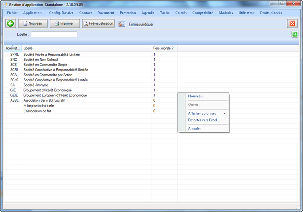 Cliquez sur le bouton Forme juridique : vous obtenez la liste des formes juridiques comme illustré ci-dessous.
