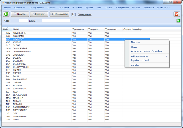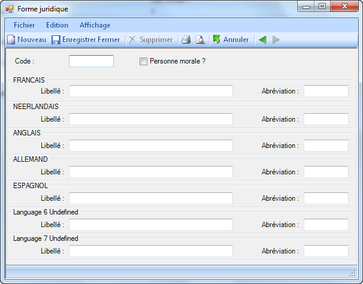Dans cette liste, sera encodée la liste des choix disponibles pour le champ forme juridique des contacts. Il faut spécifier une abréviation, un libellé en 7 langues, et si cette forme concerne les contacts personne morale ou non.