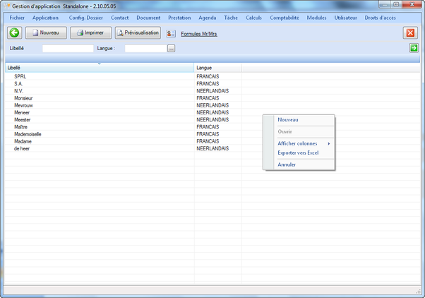 Dans cette liste, seront encodés les éléments disponibles au niveau du champ Mr/Mme de la fiche Contact, sachant que le texte pris dans la liste pourra encore être modifié. Pour chaque entrée, il faut spécifier la langue, car seuls les éléments dans la langue spécifiée pour le contact seront présentés.