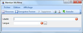Il est possible de visualiser un aperçu avant impression et d'imprimer la liste des formules Mr/Mme ainsi que d'en créer une nouvelle. Lors de la création d'une nouvelle formule Mr/Mme, la fenêtre illustrée ci-après apparaît.