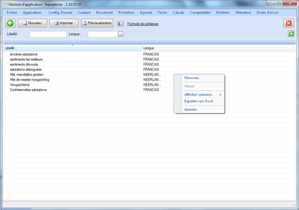 Cliquez sur le bouton Formule de politesse : vous obtenez la liste des formules de politesse comme illustré ci-dessous.