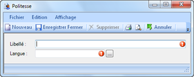 Dans cette liste, seront encodés les éléments disponibles au niveau du champ Politesse de la fiche Contact, sachant que le texte pris dans la liste pourra encore être modifié. Pour chaque entrée, il faut spécifier la langue, car seuls les éléments dans la langue spécifiée pour le contact seront présentés.