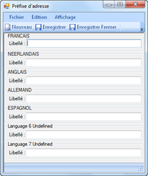 La création d'un préfixe d'adresse consiste en l'encodage de son libellé dans les 7 langues.