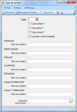 La création d'un type de contact consiste en l'encodage des paramètres suivant :