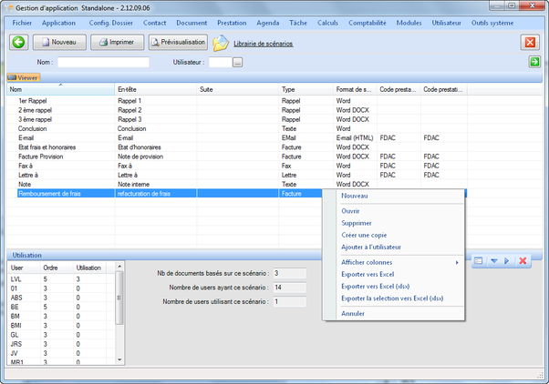 La partie inférieure de la fenêtre d'affichage de la liste des scénarios affiche les statistiques d'utilisation du scénario sélectionné.
