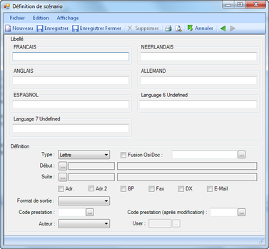 | ◦ | Nouveau : ouvre la fenêtre de création d'un scénario. |