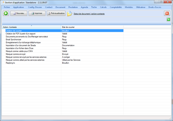 Cliquez sur le bouton Statut de document / action-contexte : vous obtenez la liste des statuts par défaut de documents pour différentes actions ou contextes comme illustré ci-dessous.