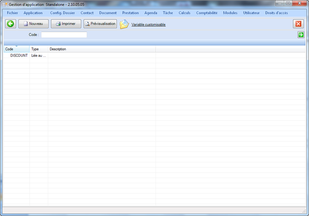Il est possible de visualiser un aperçu avant impression et d'imprimer la liste des variables customisables ainsi que d'en créer une nouvelle. Lors de la création d'une nouvelle variable, la fenêtre illustrée ci-après apparaît.