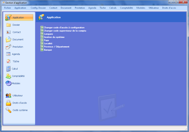Le gestionnaire d'application est accessible dans le menu Configuration de l'interface du cabinet. Ce module, protégé par un mot de passe spécifique, permet de configurer l'application DLex en fonction de vos besoins.